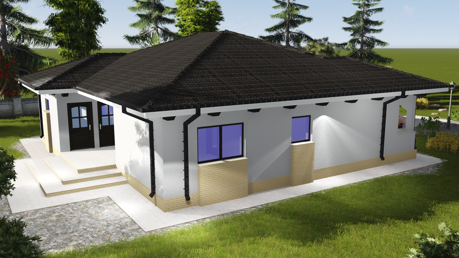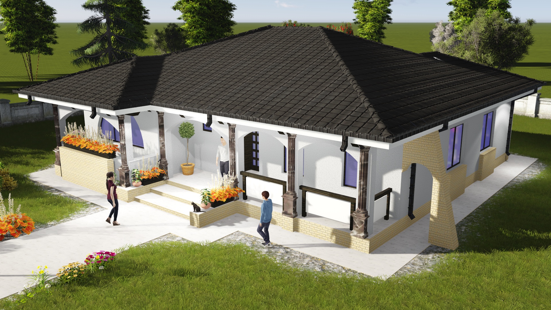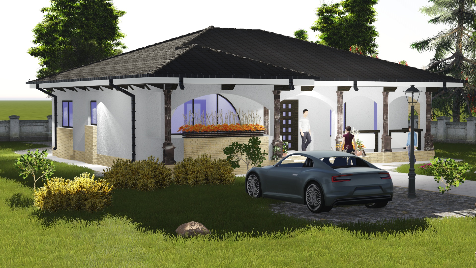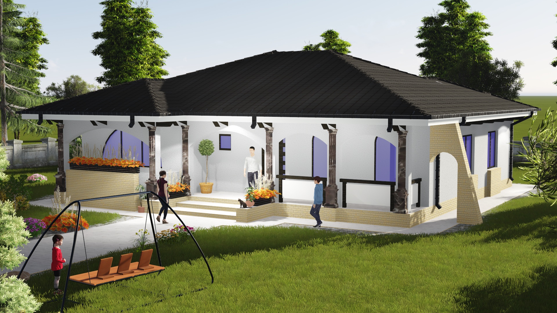 Proiectul IOV-003 este o casă parter cu arhitectură Neo-Românească reinterpretată modern, ce combină elemente tradiționale cu detalii contemporane din lemn și piatră cioplită. Cu o suprafață utilă de 105 mp, locuința oferă un living spațios, bucătărie cu acces la terasa acoperită, trei dormitoare și două băi. Construită pe structură mixtă, casa asigură eficiență energetică, costuri reduse și un confort durabil, fiind perfectă pentru familii moderne care apreciază echilibrul între estetică și funcționalitate.