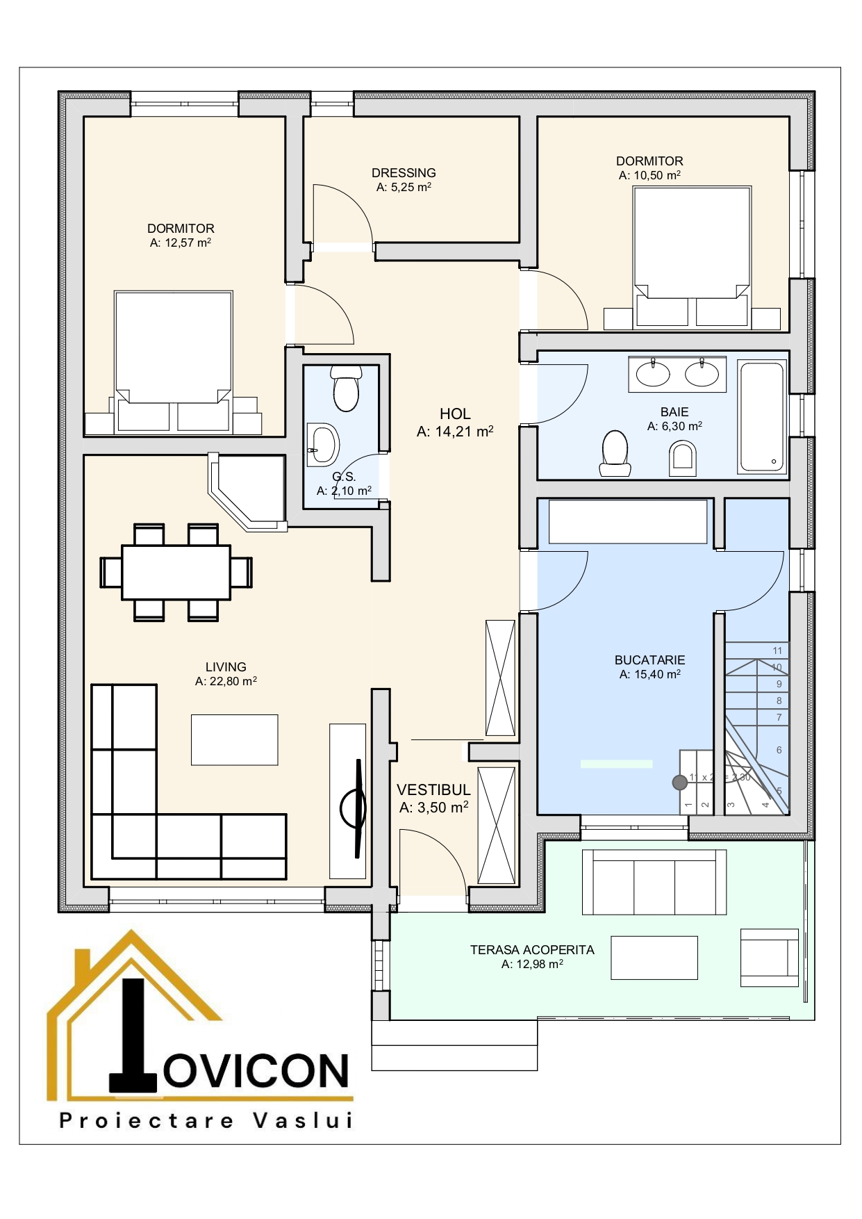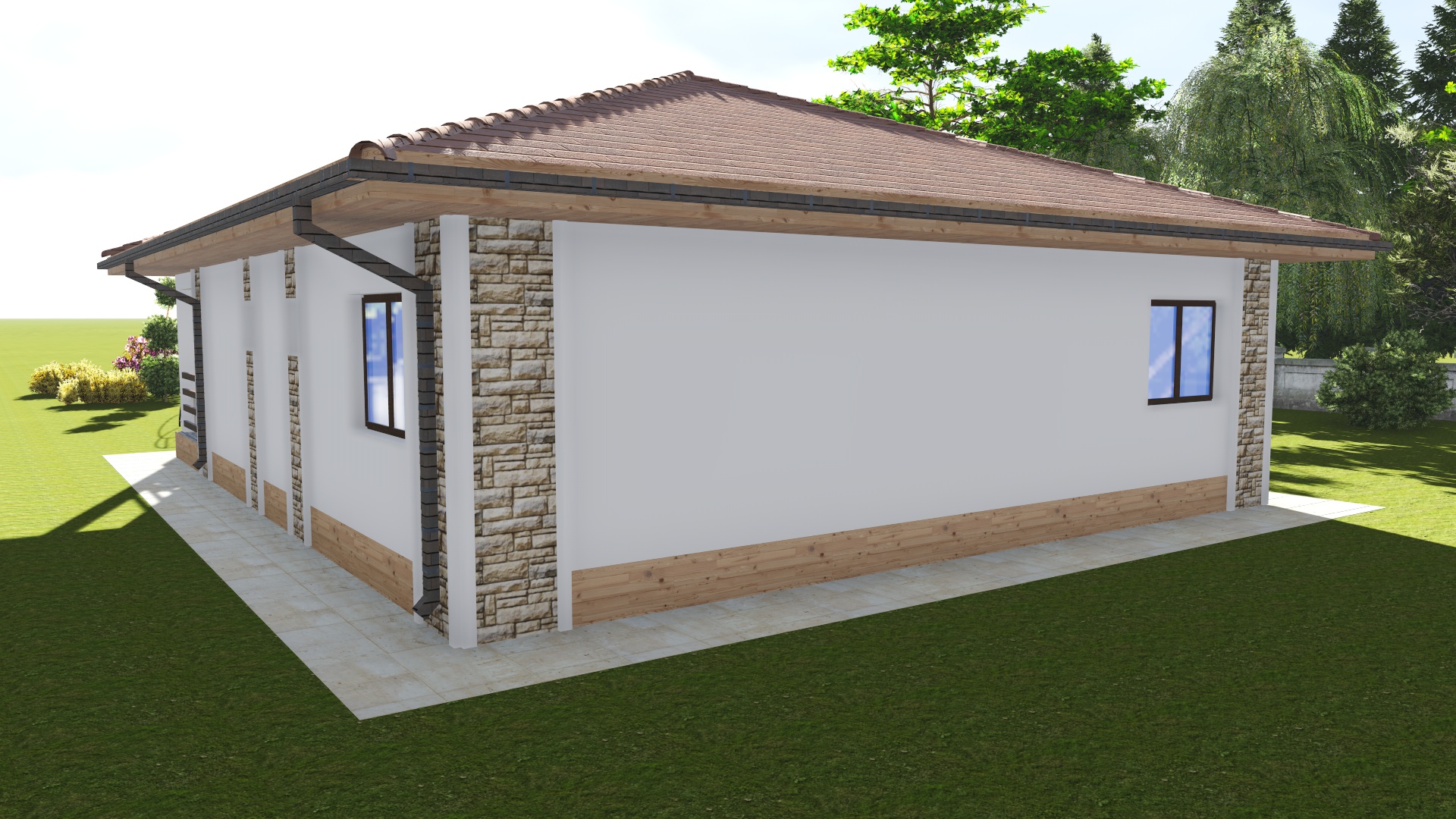 Casa IOV-007 este o locuință parter modernă, cu beci și garaj, proiectată pentru confort și funcționalitate. Cu o compartimentare echilibrată, include un living generos de 22,8 mp, o bucătărie spațioasă de 15,4 mp, două dormitoare, două băi, dressing și o terasă acoperită de aproape 13 mp.