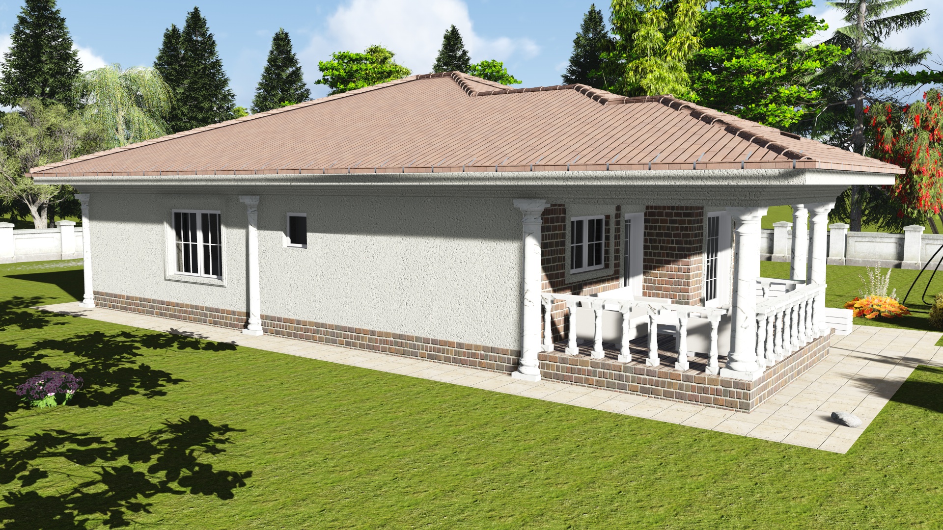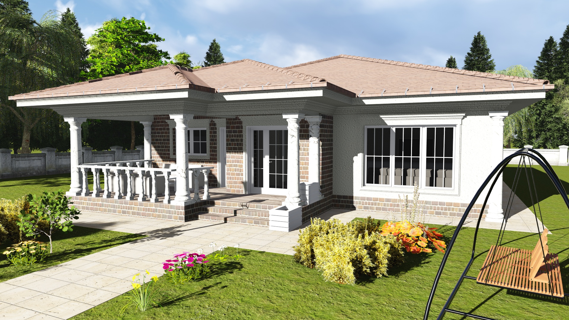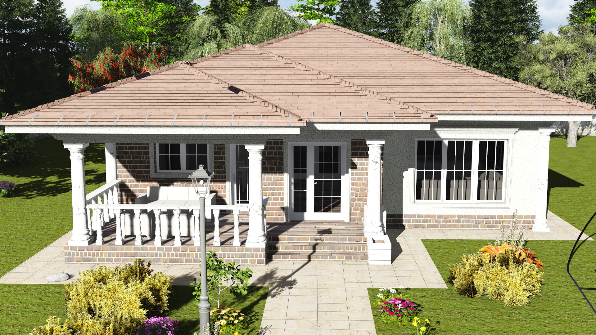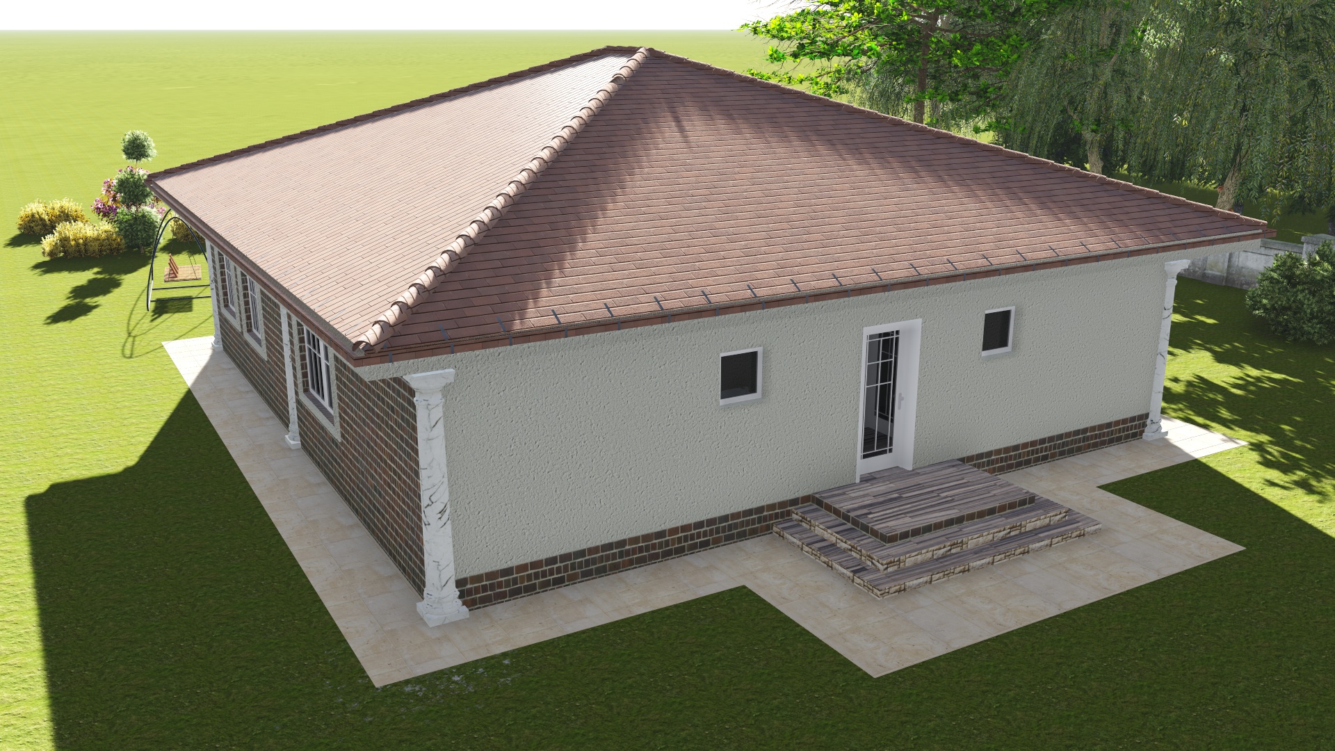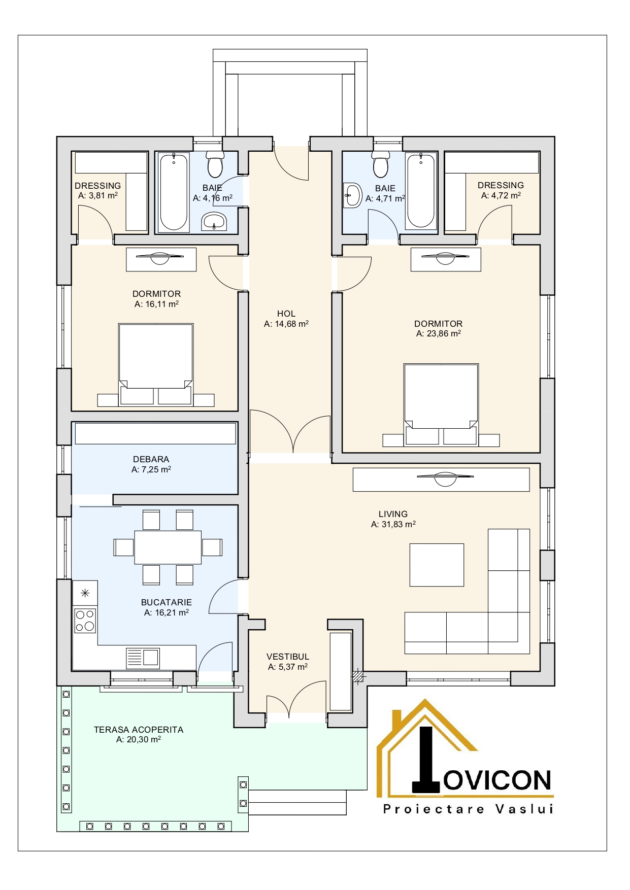 Proiectul IOV-010 este o casă parter modernă, eficientă energetic, cu volumetrie compactă și acoperiș în pante multiple, potrivită pentru o familie tânără. Dispune de două dormitoare, living separat de bucătărie, două băi, două dressinguri, debara, vestibul și terasă acoperită. Construită pe structură mixtă beton-zidărie, casa oferă 132 mp utili, design contemporan și sustenabilitate ecologică.