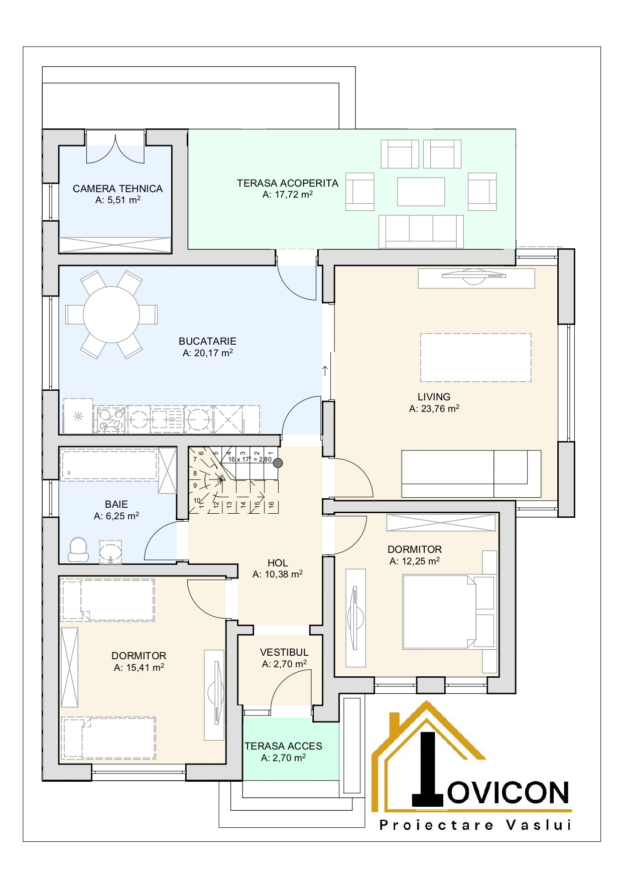 Proiectul IOV-012 este o casă parter modernă, cu eficiență energetică ridicată și design compact. Dispune de două dormitoare, living, bucătărie separată prin ușă culisantă, baie, vestibul și două terase, una de acces și una acoperită pentru relaxare. Construită pe structură mixtă beton–zidărie, casa are 96 mp utili și promovează sustenabilitatea și confortul natural.